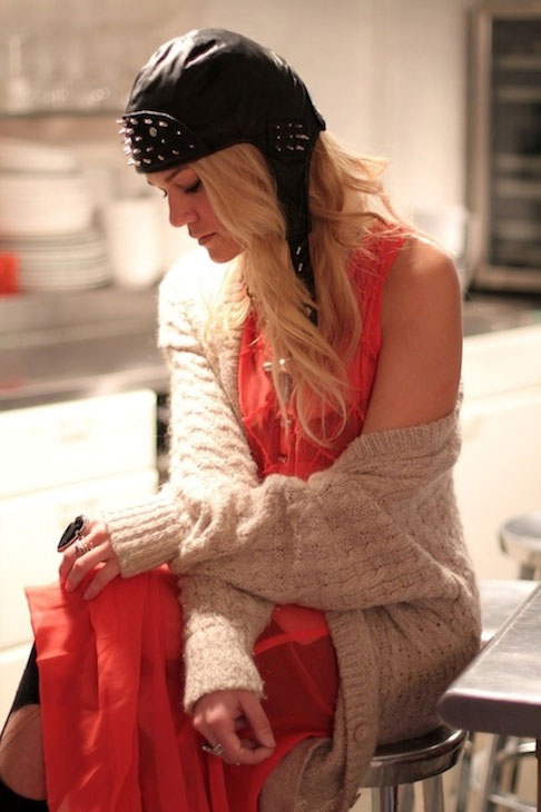 "I do shop [at Topshop] a lot because it's down the street from my house. For me in New York, I don't have those 'Aha!' fashion discovery moments. I never get that at home. I have so much more fun when I go home to Cleveland, or to Pennsylvania or Montauk. In New York everyone has such a keen eye and it's not like you're discovering some new treasure. It's already been discovered." Vintage hat, Acne t-shirt, vintage Givenchy jacket, vintage skirt, Esquivel boots
